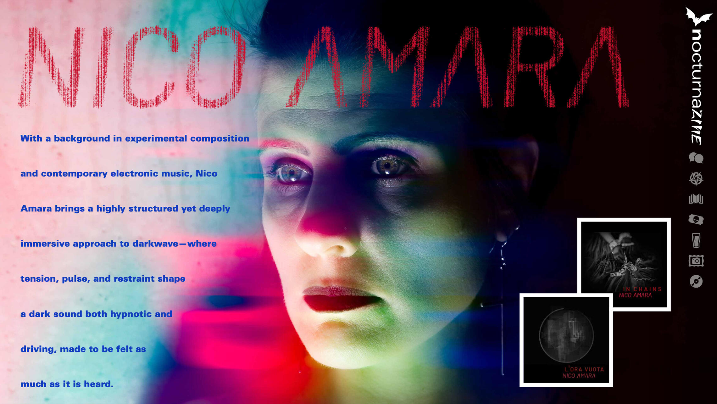 Nico Amara ist das Darkwave-Soloprojekt der experimentellen Komponistin und multidisziplinären Künstlerin Nicole Fior-Greant (Schweiz), die in europäischen Festivals für zeitgenössische elektronische Musik aktiv ist. Mit diesem Projekt öffnet sie eine verborgene Tür und präsentiert ihre Debüt-Album—ein erster Einblick in eine präzise komponierte Klanglandschaft, in der minimalistische Strukturen auf subtile, komplexe Schichten treffen.Inspiriert von Darkwave, industriell geprägter Elektronik und klassischen zeitgenössischen Komponisten, verbindet ihre Musik technische Raffinesse mit kalten, distanzierten Dark-Electro-Beats und mechanischen Texturen, geformt durch dissonante Klänge, langsame Filtersweeps und modulierte Reverb-Trails. Diese Elemente verbinden sich mit texturierten, minimalen analogen Synth-Flächen und erschaffen eine immersive, düstere Klangwelt.